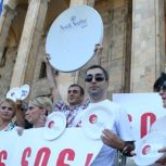 პარლამენტის წინ ტელეკომპანია „მაესტროს“ მხარდასაჭერად მიმდინარე აქციაზე მედიასაშუალებების წარმომადგენლები სპეციალურად მიტანილ სატელიტურ თეფშზე სიმბოლურად ხელს აწერენ.